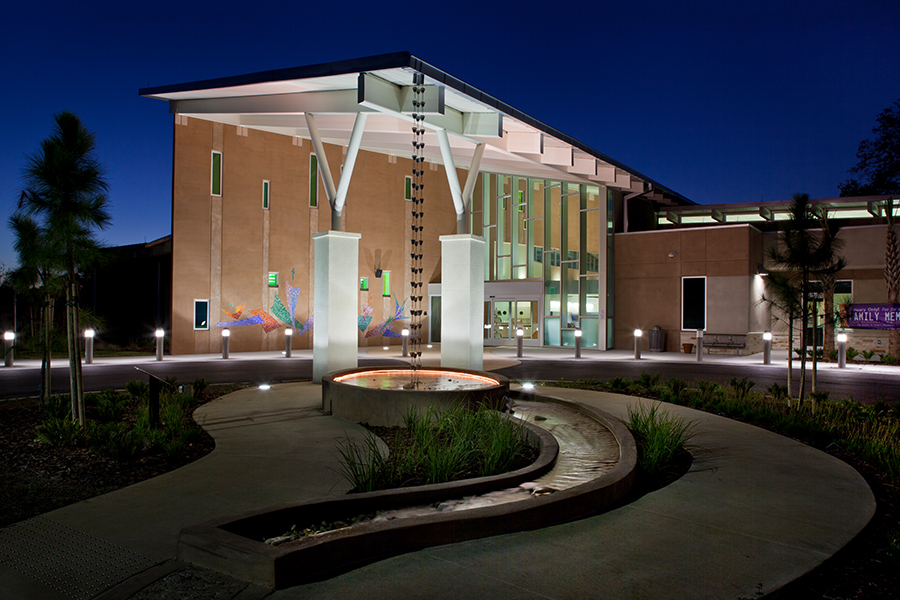 Largo Community Center is a senior focused, LEED Platinum community center, providing recreation programs that include an auditorium, art room, game room, and card room. We created a site for the building from a non de script suburban parcel. The original community center was devoid of a single window and no exterior green space. Inside, the patrons would try to mingle in a five-foot corridor that doubled as a lobby. Although the environment wasn’t ideal, there was a wonderful display of kinship shared by the patrons and staff which we wanted to design the new building around. We first organized the new building around the patrons. Corridors were eliminated, consolidating all circulation within a large central lobby. This lobby acts as a city square providing the building with a social center. The patrons can now mingle and survey the entire facility together at one time. It is the place to meet and a space to relax between classes. We believe this space will extend the length of participant stay and the number of classes they take.