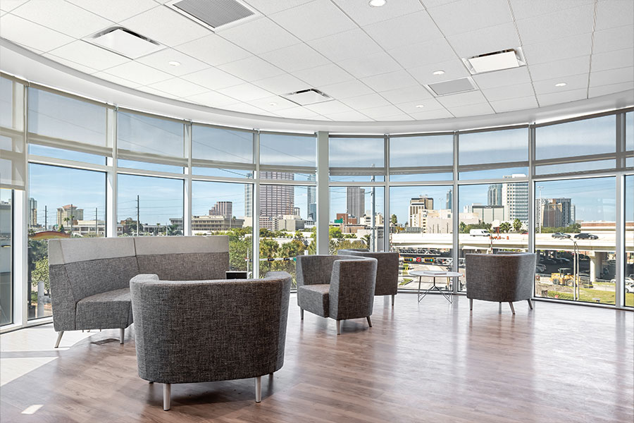 The use of textures, colors, and materials to create a calming, happy, and healthy place to work and serve the Tampa Bay area.