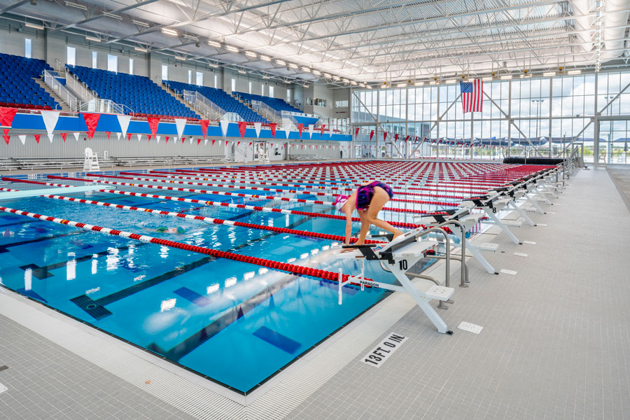 The natatorium features an indoor cast-in-place concrete 10-lane/50-meter/25-yard Olympic competition pool with seating for more than 2,000 spectators. The outdoor āLā shaped pool includes the 5-lane 25-yard warm-up area and 7-lane 50-meter/25-yard/25-meter 2021 Olympic Trials warm-up pool by Myrtha Pools with a second level outdoor deck. There are two indoor/outdoor video scoreboards with Colorado Timing System as well as a timing room. The facility is equipped with top-tier equipment to train, host, and engage in recreational activities at the local, state, regional, and national level.
