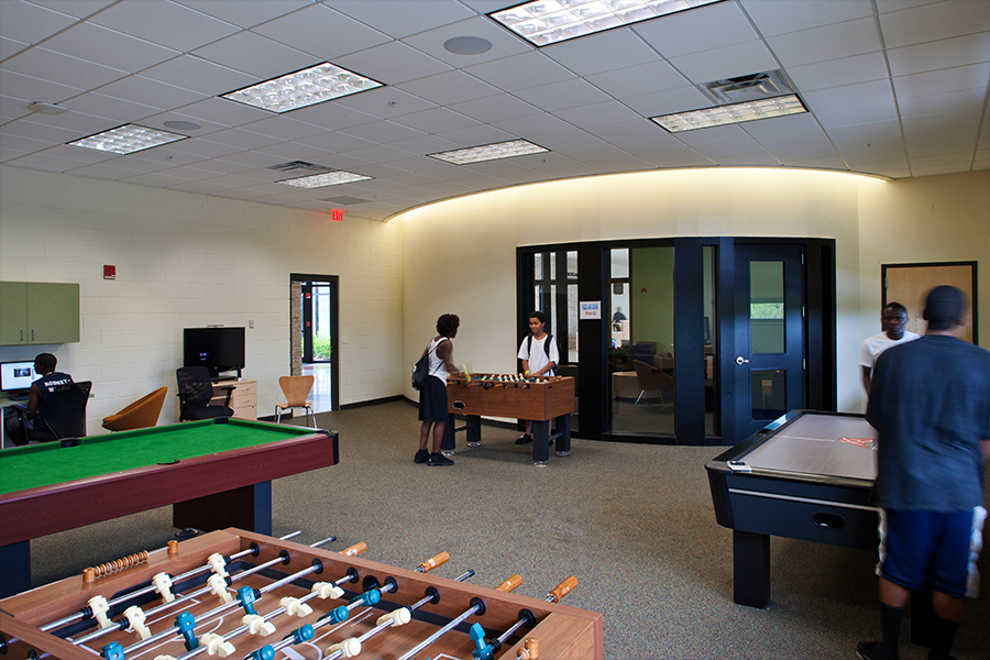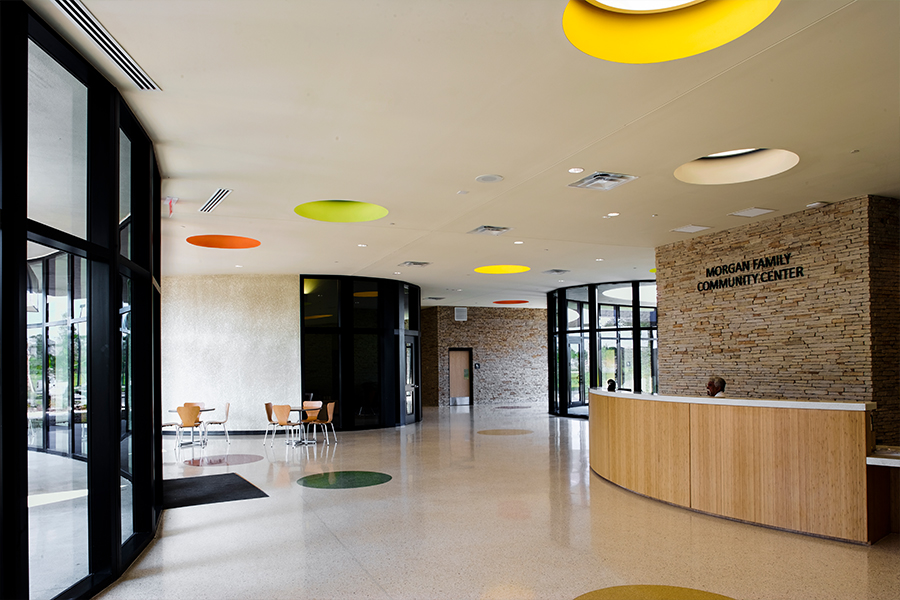 Featured amenities are an expanded gymnasium with 6 basketball backboards, fitness center, dance room, teen lunge, multipurpose room, game room, arts and crafts room, meeting space and outdoor social areas. Substantial time was spent obtaining input from the community, the staff, and the City Commission during the programming and conceptual design phases.