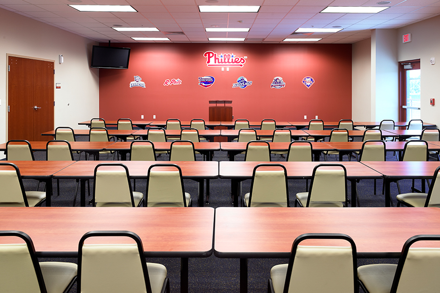 The Phillies vertical pinstripe, home uniform is reflected in the entrance element, allowing the materiality to create the pinstripe effect. A new second floor addition includes six private offices, large equipment room, and a large conference room for team meetings. The continuous walkway around the entire second floor provides a visual connection to the four practice fields and is utilized by coaches to analyze the player’s skills.