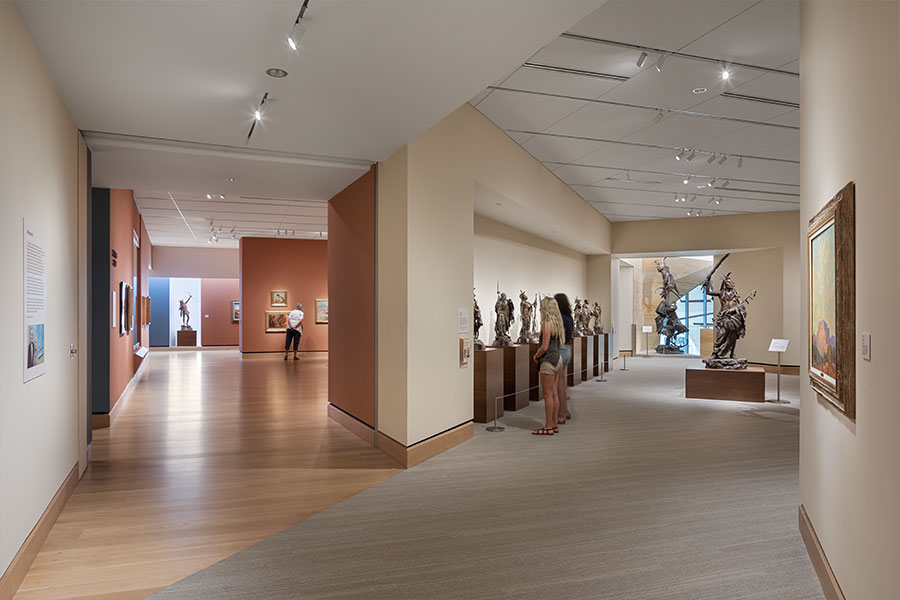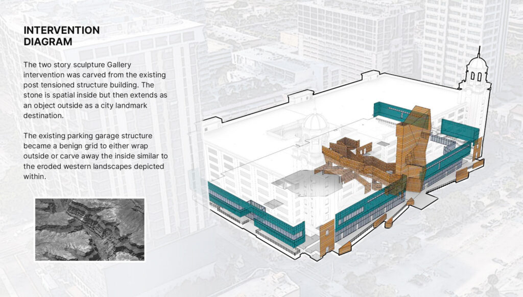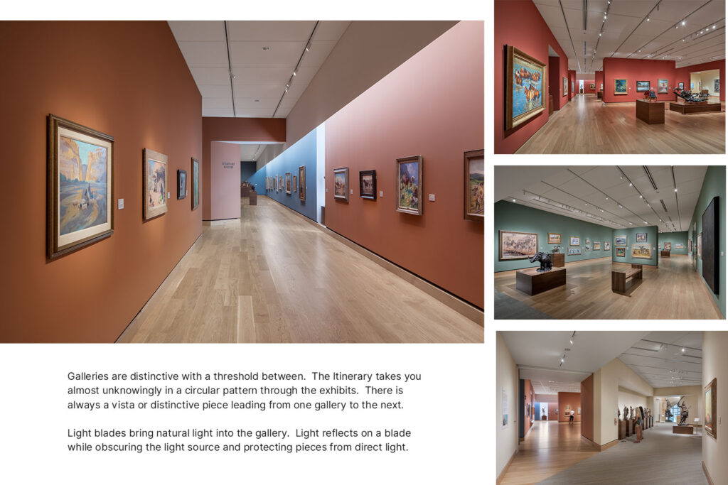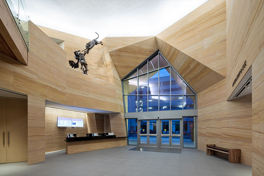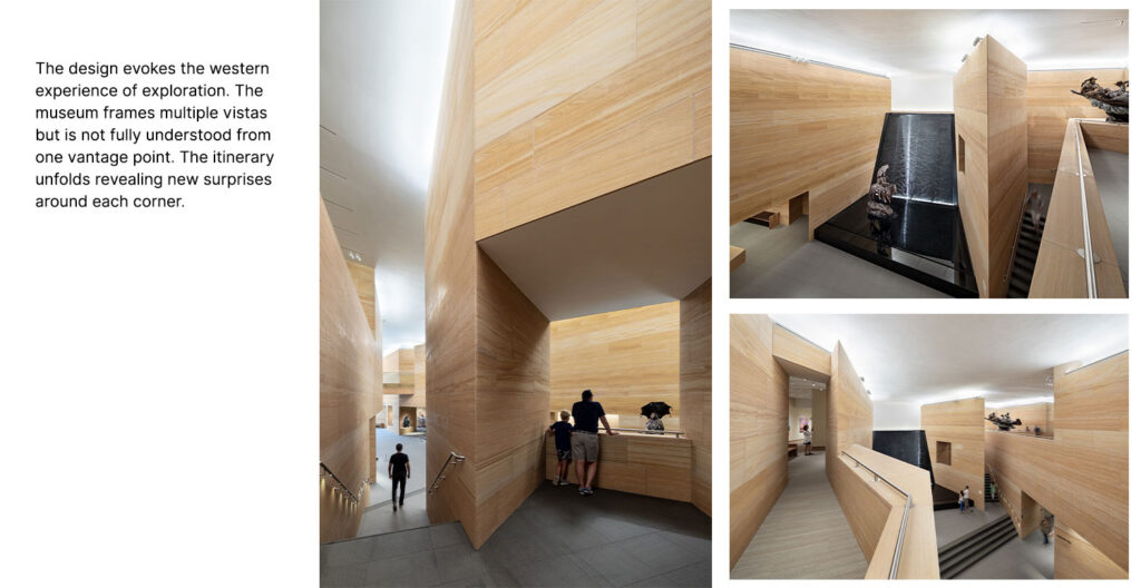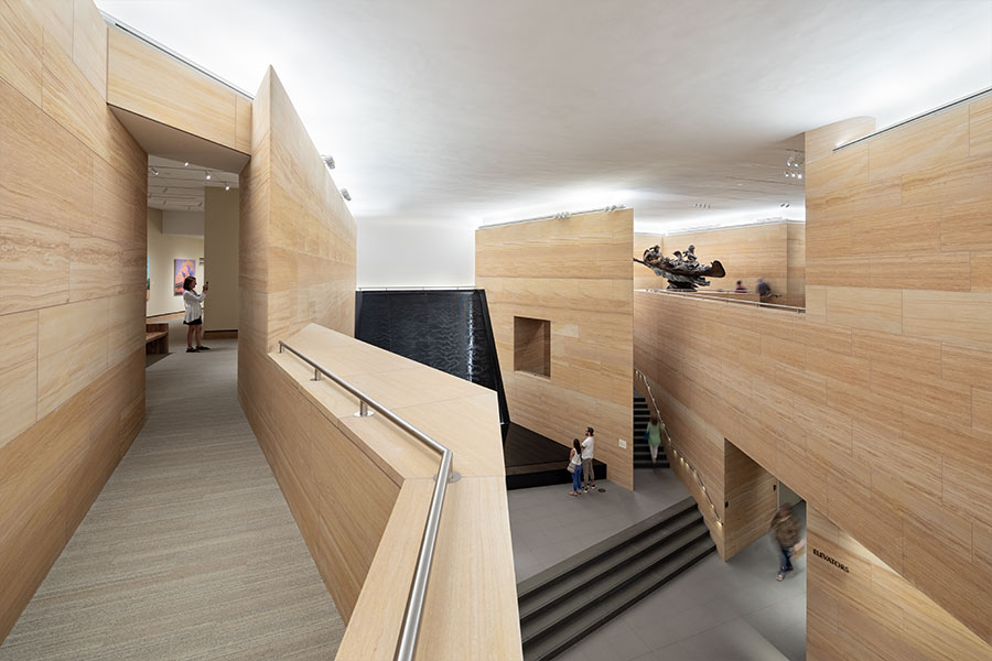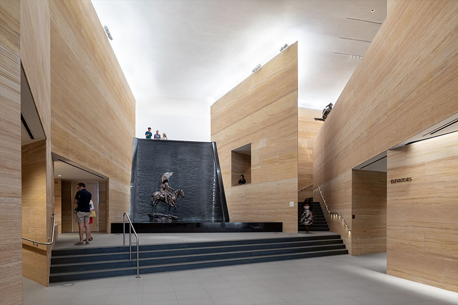 The design’s abstract geometry evokes the west, with veined sandstone reflecting the coloration of Southwest canyons set against the turquoise of weathered copper. The museum entrance is signaled by the new 9-story high sandstone “Mesa”, through which visitors enter the two-story high “Arroyo” entry and sculpture hall, continuing the sandstone banding of the exterior. A museum café and retail store are to the left of the entry doors; to the right is a reception desk and doors to a flexible event space, seating a banquet of 400, and able to be split into two for separate functions, served by a fully equipped catering kitchen. A sloped-floor auditorium seats 129, equipped for film, panel discussions and musical presentations. A reflecting pool and high waterfall at the far end metaphorically carves the Arroyo, beckoning visitors to the elevators and stairs leading to the painting galleries upstairs. The large high-ceiling galleries feature diffused UV-filtered natural light on the north and east walls, using an innovative “light blade” reflector. Throughout, attention was paid to ensure easy maintenance, clear visitor flow, high security, and create spaces that generate potential museum rental revenue.