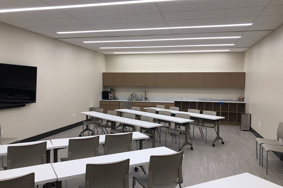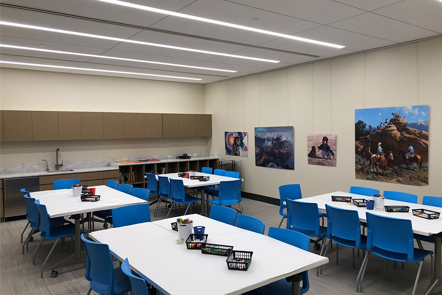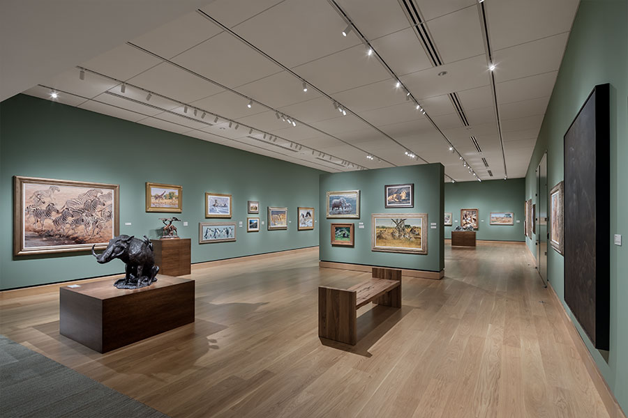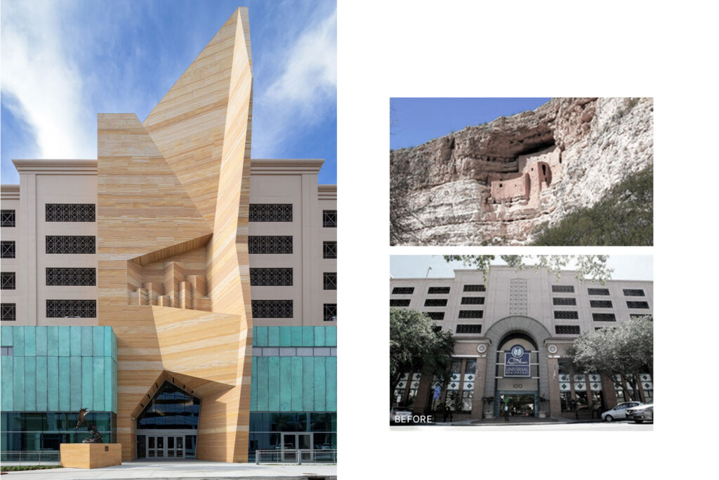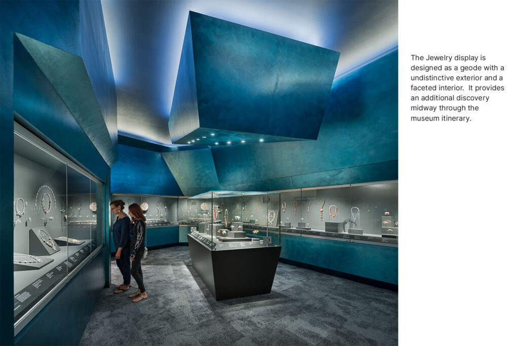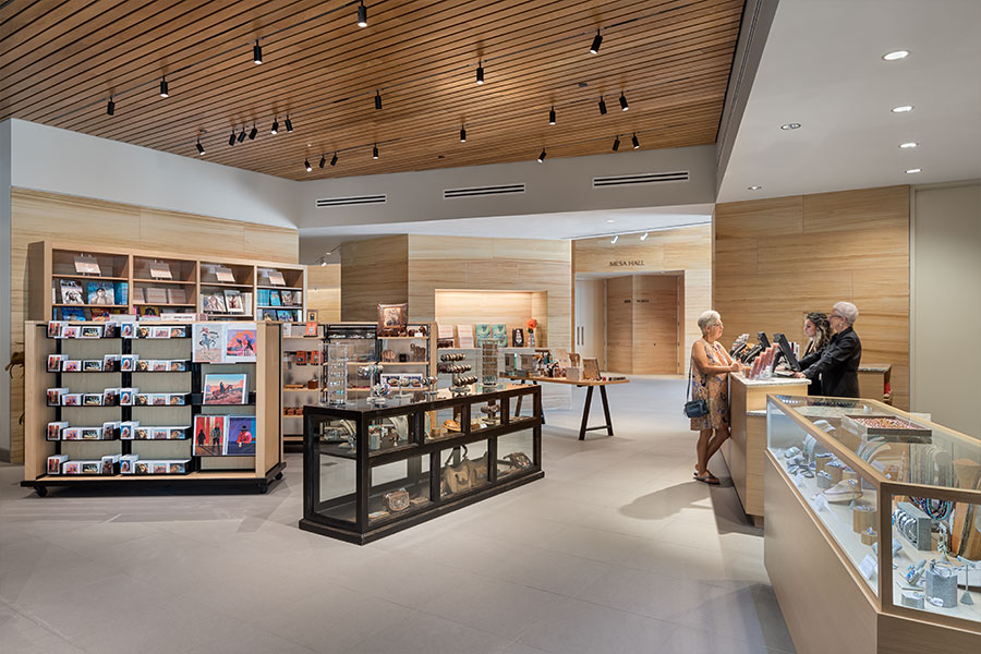 The design’s abstract geometry evokes the west, with veined sandstone reflecting the coloration of Southwest canyons set against the turquoise of weathered copper. The museum entrance is signaled by the new 9-story high sandstone “Mesa”, through which visitors enter the two-story high “Arroyo” entry and sculpture hall, continuing the sandstone banding of the exterior. A museum café and retail store are to the left of the entry doors; to the right is a reception desk and doors to a flexible event space, seating a banquet of 400, and able to be split into two for separate functions, served by a fully equipped catering kitchen. A sloped-floor auditorium seats 129, equipped for film, panel discussions and musical presentations. A reflecting pool and high waterfall at the far end metaphorically carves the Arroyo, beckoning visitors to the elevators and stairs leading to the painting galleries upstairs. The large high-ceiling galleries feature diffused UV-filtered natural light on the north and east walls, using an innovative “light blade” reflector. Throughout, attention was paid to ensure easy maintenance, clear visitor flow, high security, and create spaces that generate potential museum rental revenue.