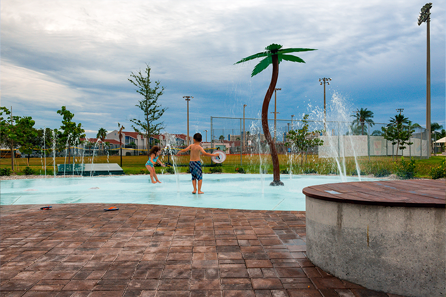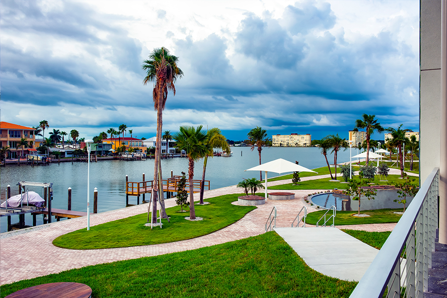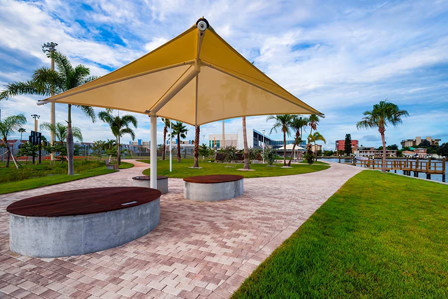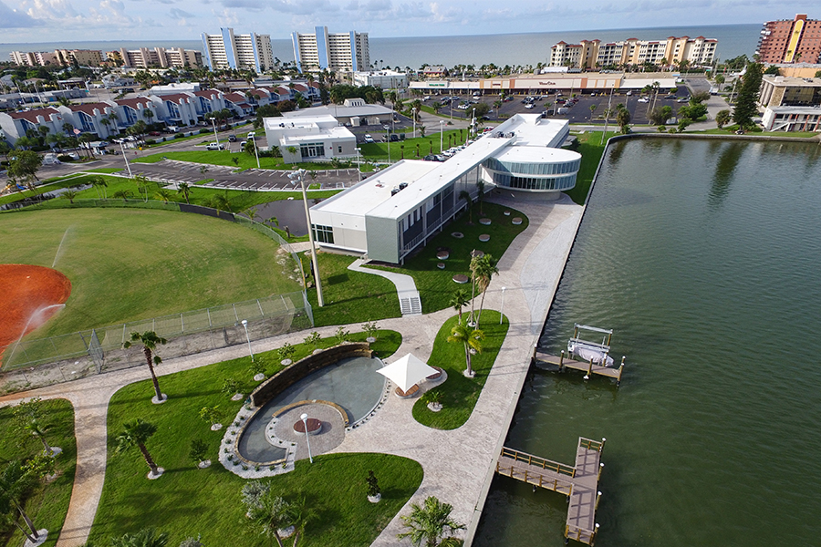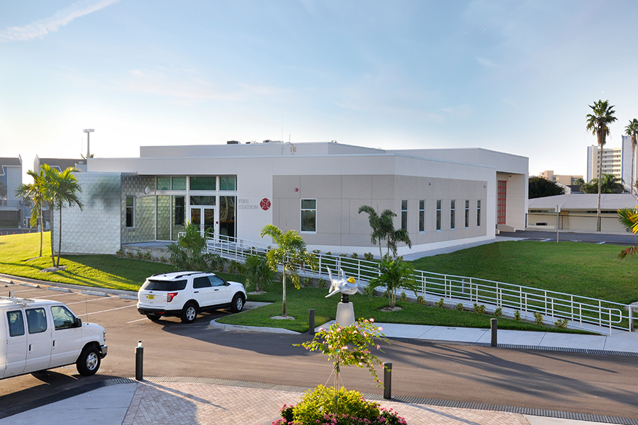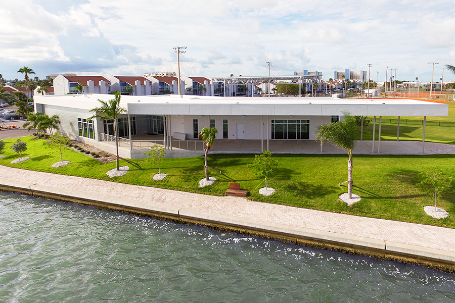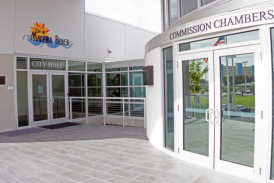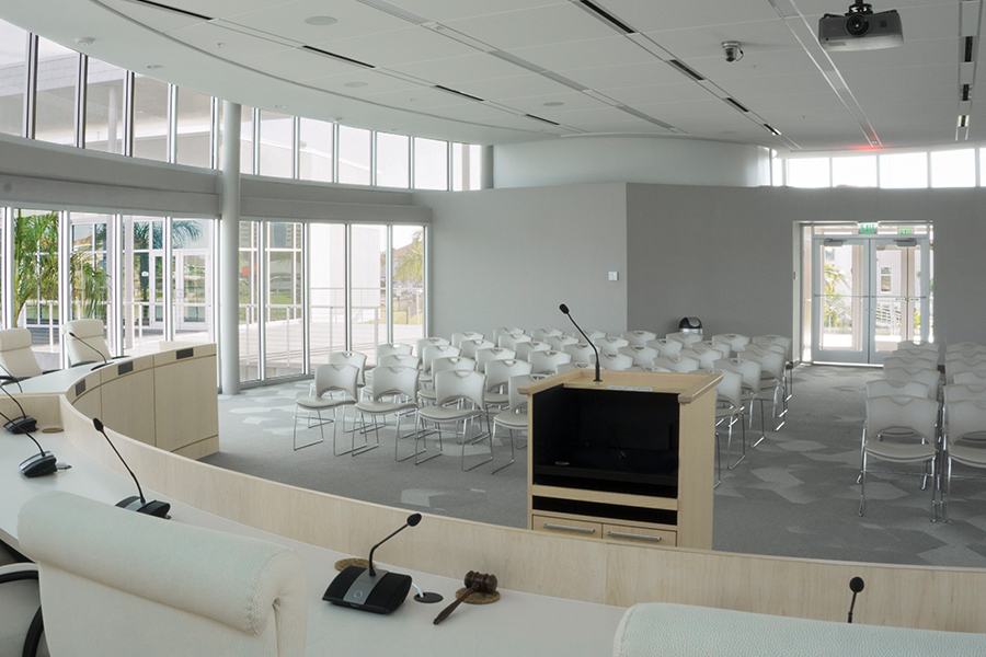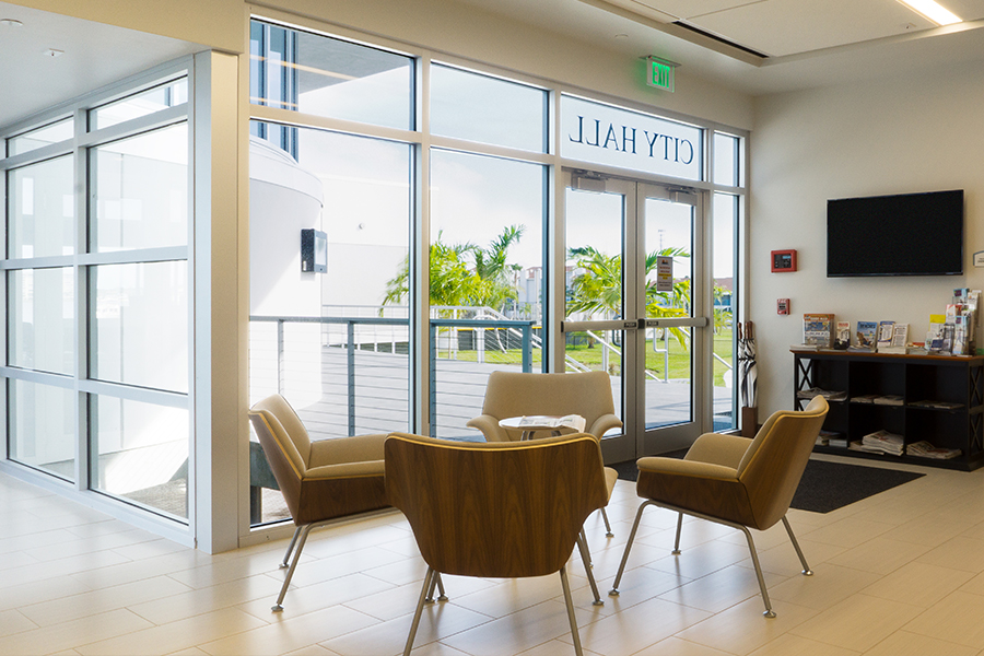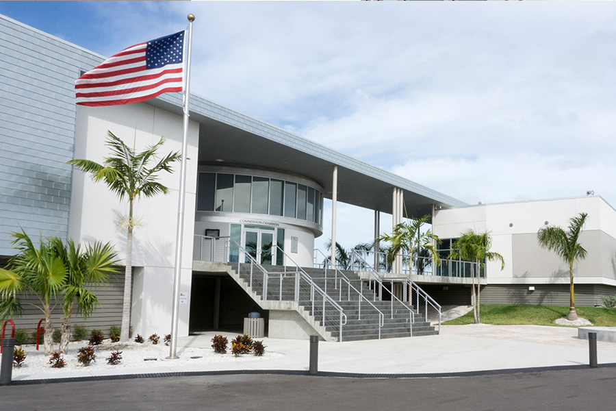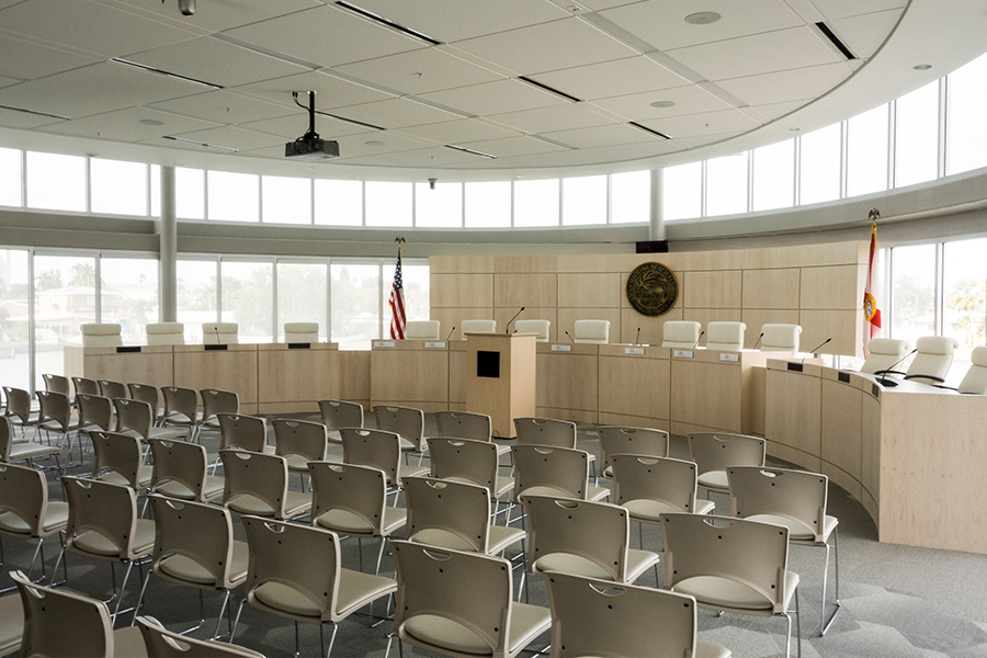 The Madeira Beach City Hall is situated at the west end of a municipal complex also consisting of a fire station, recreation center, and community park. This project provided the opportunity to weave together large multi-use public space with core civic activity. This multi functional municipal structure blends with parkland and waterfront to form a community hub. Combining exterior circulation with new relationships between public space and public services, creates event spaces to be utilized by all. Even the commission chambers can be used by the community for personal events. The chamber is purposely extracted from the typical interior location and is exposed as a transparent volume that serves both as a place of civic engagement and as a lantern that invites people to the expansive park and waterfront edge.