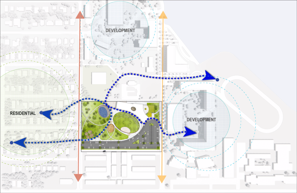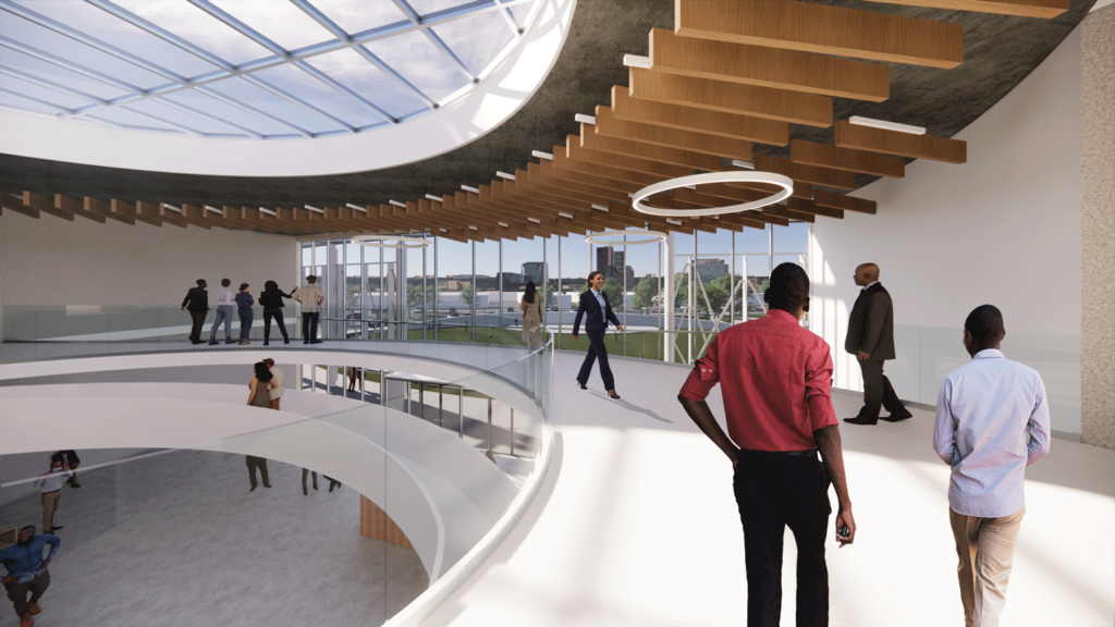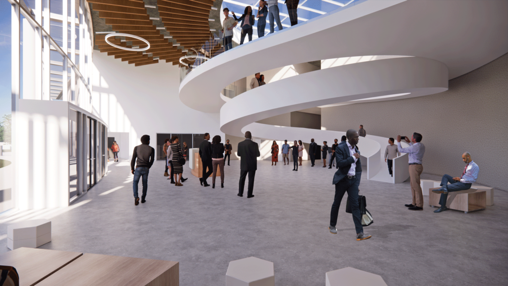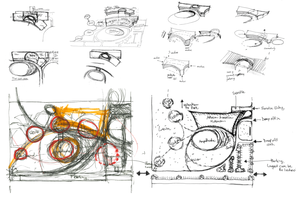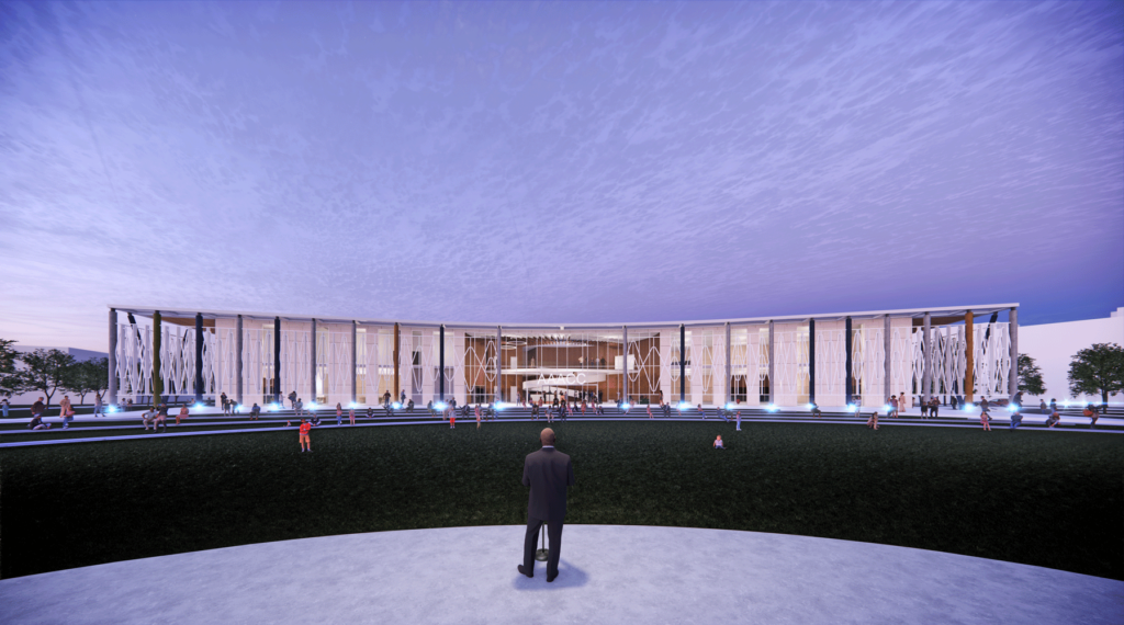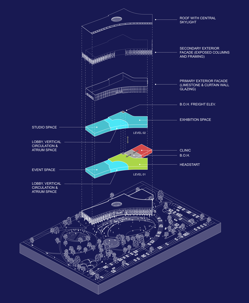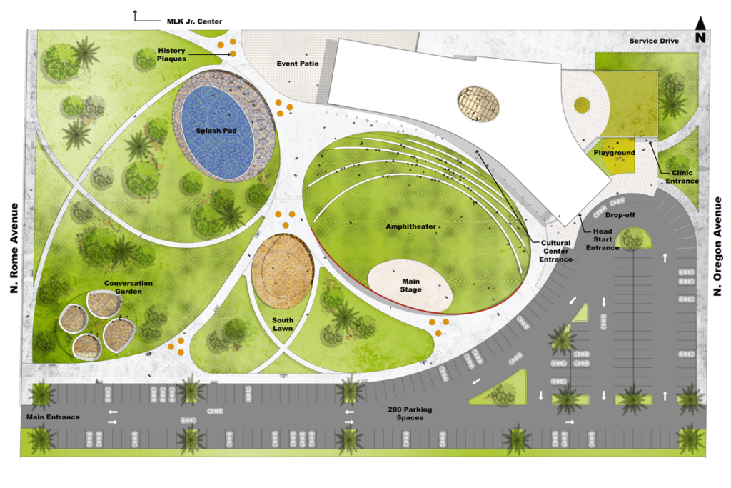 Our vision, inspired by the organization of the traditional dwellings in Cameroun and scaled to serve the community of Old West Tampa is the stitch between residential and new development. A great lawn with exterior community programs that connect and educate the visitors as a experiential journey to the AAACC that is seen beyond. The 45,000-sf building is the backdrop to the Amphitheater and seen across the lawn with 200 parking spaces. Individual entrances to the Cultural Center, Head start and Clinic provides security and discretion without disrupting the community experience. Dedicated entry drop-off with a singular service drive that supports all 3 major program spaces gives the AAACC a functional and efficient design solution for a complex yet exciting program.
