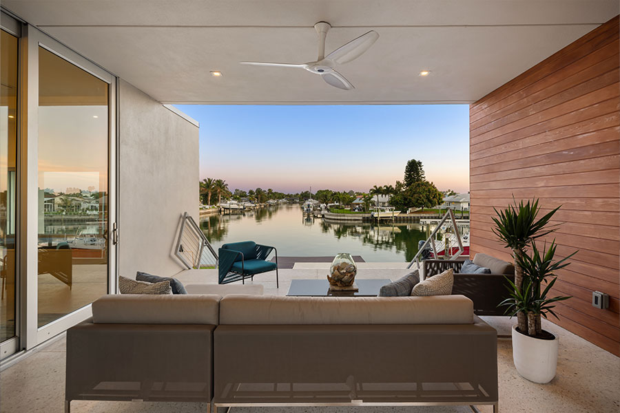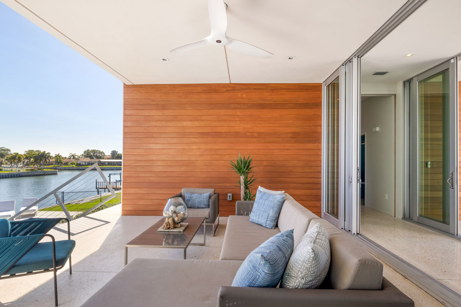 New construction for the 2,800 sf home had the advantage of being one of the few remaining vacant lots with access to the Boca Ciega Bay and opportunities for boating and life on the water. The organization of the home was strategically based on this relationship and includes an additional 1,000 sf of covered deck space overlooking the backyard, pool, and bay for a vibrant social space.