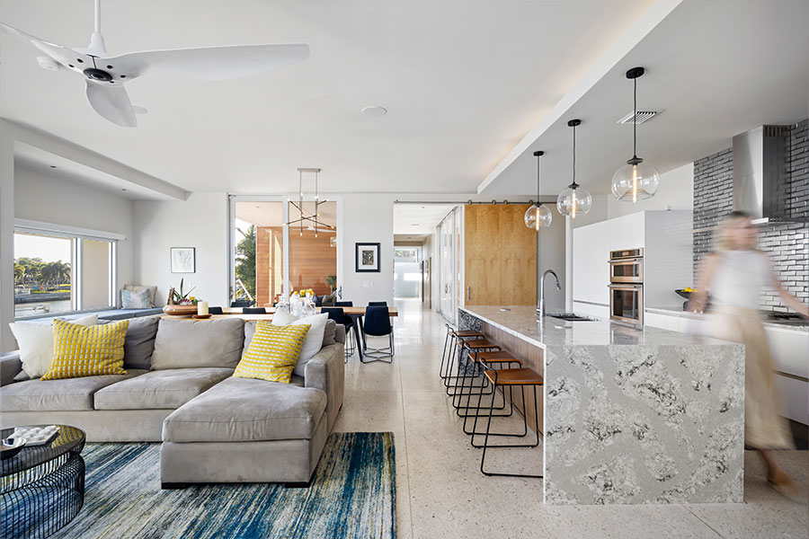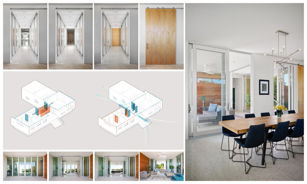 The open plan optimizes the use of space, with a minimal number of walls dividing spaces. Oversized sliding barn and pocket doors help to divide the spaces when required for privacy, while allowing connectivity from one side of the house to the opposite side. The corridor both connects and separates the rooms in the house. Service and utility spaces, such as laundry and bathrooms are across the corridor from the bedrooms that they support, which maximizes the size of bedrooms with window views of the water. The modern house is minimal in expression and materiality and becomes the backdrop for entertainment and socializing with family and friends.