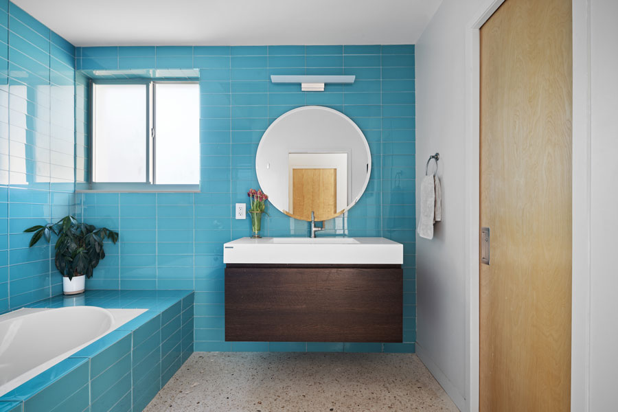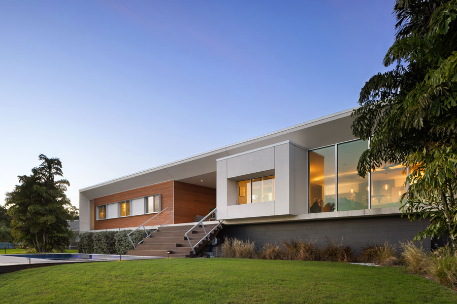 The challenge of a high flood plane requirement was turned into an opportunity, as the main living level needed to be raised a half level above the ground. The welcoming front entry stair has a grand scale that flows from the landscape at the center of the house. Full height, sliding glass doors create an entry foyer that divides the public functions of the living room, dining room, kitchen, and kids’ playroom to the east and three private bedrooms to the west, with the primary bedroom anchored at the end of the corridor. Another set of sliding glass doors open directly onto the covered outdoor deck. Views through the glass foyer to the water are immediate. A social stair with bleacher seating leads down to the pool and waterfront yard, becoming an event space for celebrating sunsets.
