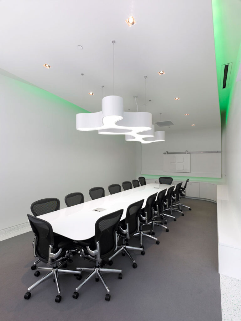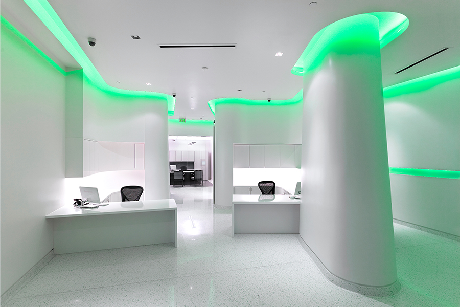 In the age of social media, where a company’s face may be solely relegated to Twitter and Facebook posts, Community Bank strives to bridge the on-line experience with the off-line experience. This new, flagship branch is located along Beach Drive in St. Petersburg, FL and houses five specific zones within the facility. The programmable LED lights splash onto an impeccable white canvas of compound curving forms, reminiscent of Apple products, thus becoming a visual barometer for the company’s brand, mood, social awareness and public relations.