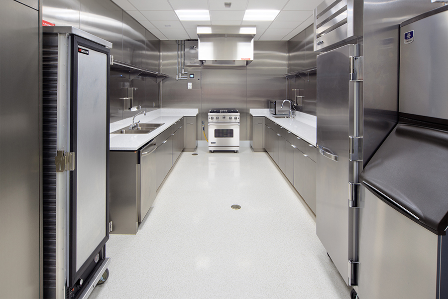 The space was created to allow this 9 to 5 bank to morph into an event space for customers or charities. There is a stainless steel catering kitchen, movie projector, and moveable furniture to accommodate events.