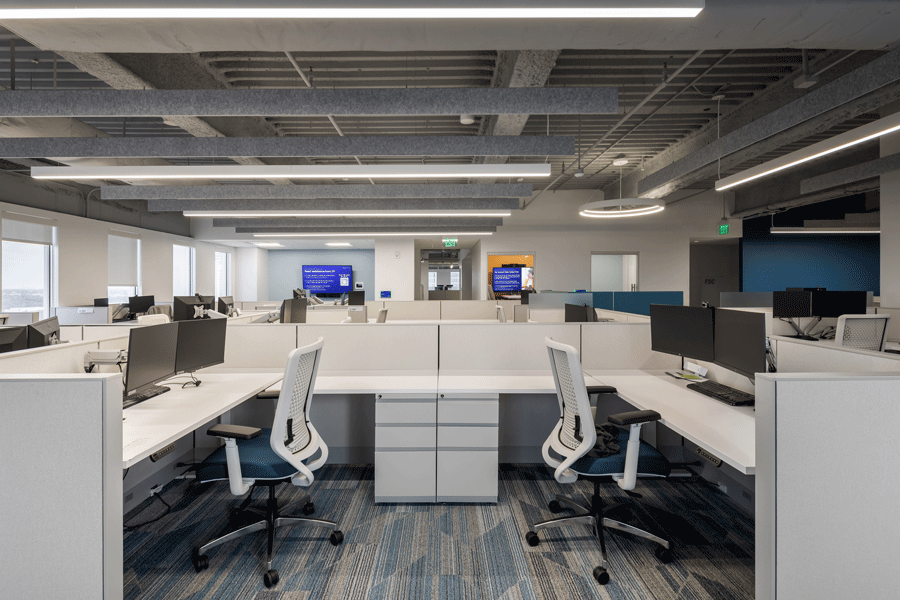 The goal of this project was to turn an existing space that lacked natural daylight and collaboration space across multiple floors of a tower in Downtown Tampa into an open space, collaboration hub. This was accomplished by providing large open collaborative areas and workstation hubs that we were able to fit the client’s needs for their all groups within their organization.