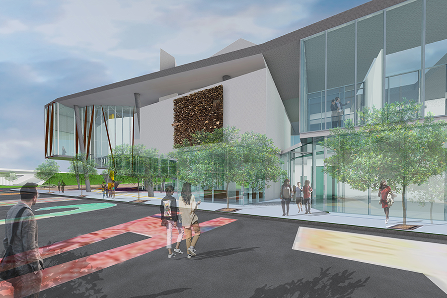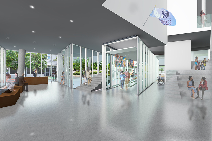 The design resituates The Woodson within a lush landscape including a grove of Oak trees that provides outdoor gathering and seating areas at the north side of the building and new multi-functional courtyard at the south side of the building that extends to the existing Legacy Garden. Primary spaces at the ground floor include a Visitor’s Center; the Equity Center including seminar room and library; a flexible interior Event Space; and Gift Shop. From the ground floor, and elongated feature stair extends the entry processional from the Oak Grove; through the entry terrace; and to the exhibitions spaces at the second floor. The exhibition spaces include a temporary gallery as well as two galleries for permanent exhibitions. Each gallery is designed to receive abundant natural lighting through skylight monitors oriented to receive desirable northern daylight for viewing artwork. The galleries are surrounded by a large outdoor sculpture garden that cantilevers above entry terrace and courtyard below while providing shading as well as additional multi-functional exterior space.