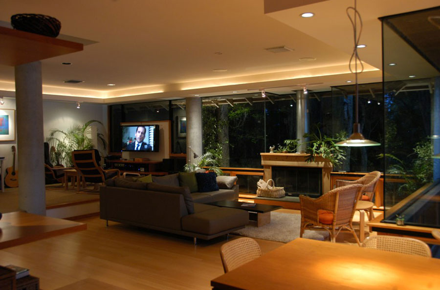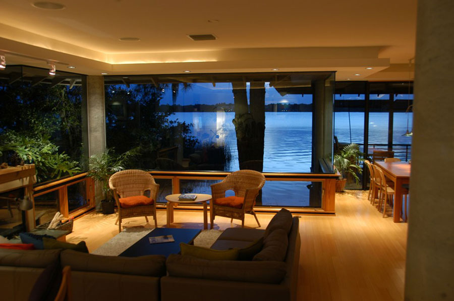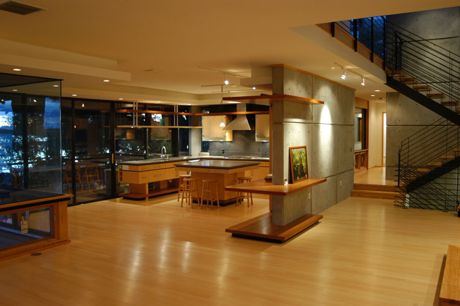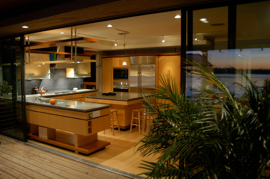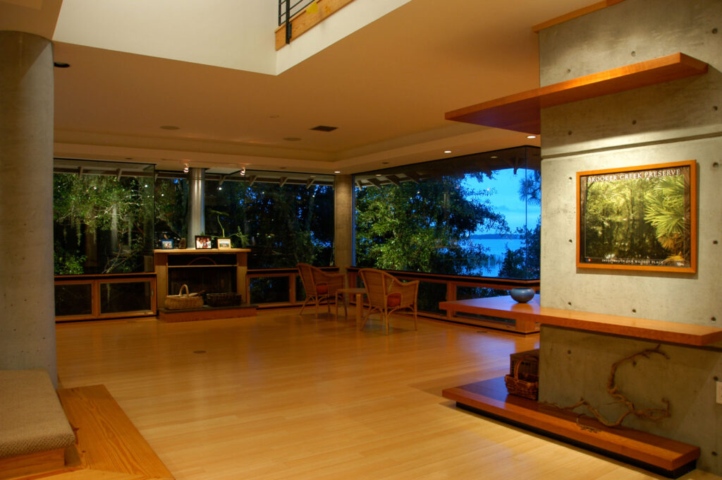 The ground floor, housing a woodshop and a garage, serves as a concrete base to support the vernacular-style cedar living level among the treetops. The main living space on the second level features transparency and daylighting through use of walls of glass, big windows, skylights, and frosted glass, which are purposeful and bring in the woods and lake views, making it feel like a tree house. The third level hosts a guest loft. The entrance is designed to peak through to Lake Tarpon, so guests need not enter the home to go to the lakefront decks.