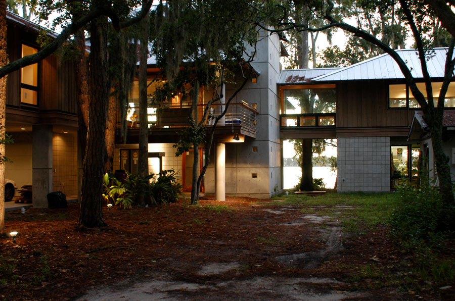 The architect desired to break away from the frame vernacular Florida homes he had designed for years since college and use the elements from his educational experience of concrete, glass, and steel, or Le Corbusier and Mies. The biologist wanted a “cracker cottage in the woods.” The result is a masculine concrete base supporting a more feminine delicate vernacular wood and glass form within the trees. This home mixes materials and forms, representing the complex dichotomy of both human and material marriages, celebrating individuality yet harmonizing the relationship.