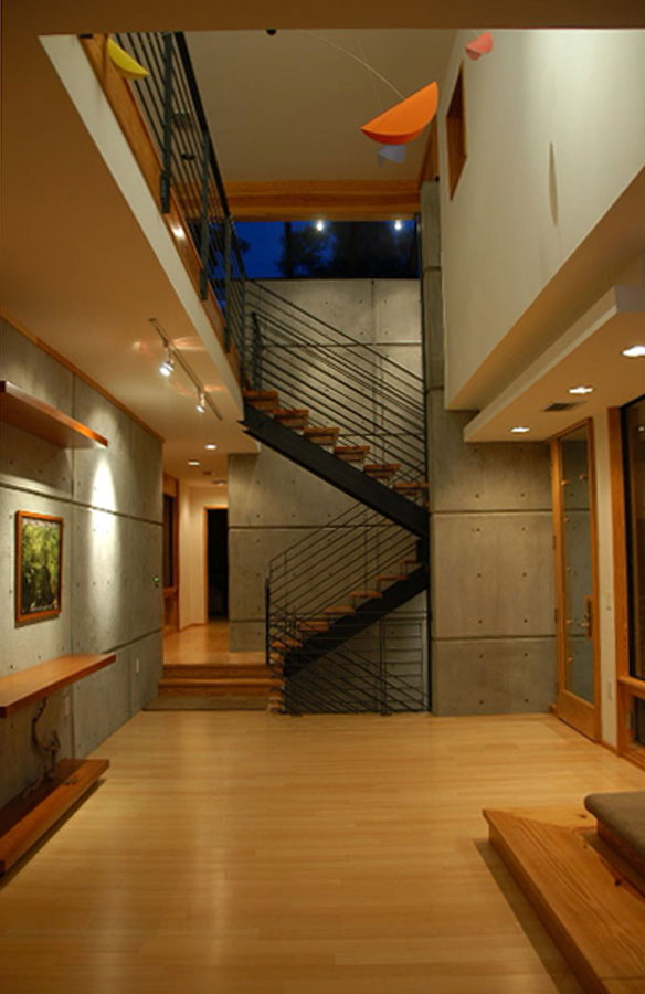Completed in December 2006, this three story 3,500-sf home is situated on a large, private wooded site that is surrounded by wetlands on three sides. The major design influence on this house was bipolar on several levels between the modern and traditional likes of the owners, an architect and biologist.