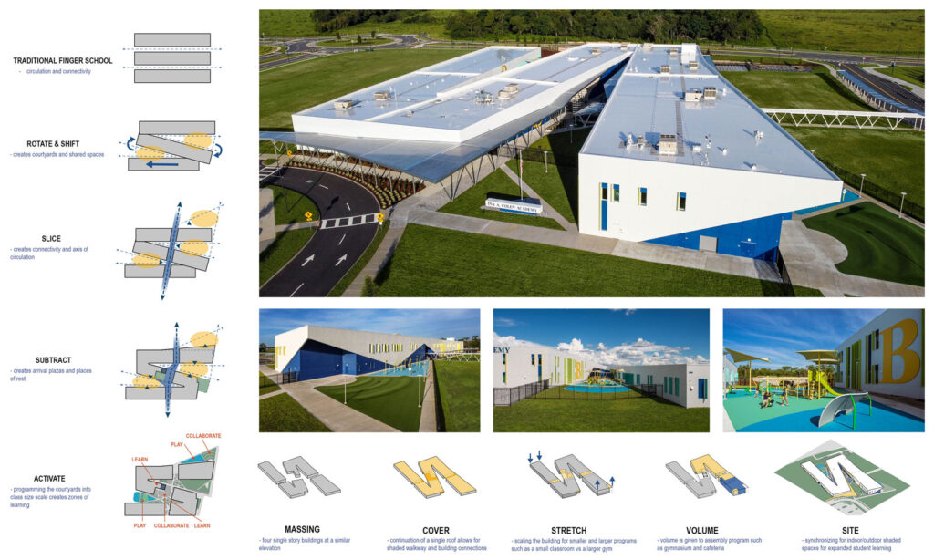 The design forms a large “Z” shape starting with the tallest 2-story program, the gymnasium, and sloping down to a one-story building, the kindergarten building. This form helps break down the scale of a large K-8 school into the scale of a class. An example of this are the courtyards which are activated by solar canopies, functioning as shade structures for the outdoor classrooms, age-oriented playgrounds, and class garden areas. These zones feel intimate enough to not be overwhelming to a student and open enough for easy passive surveillance for the teacher.