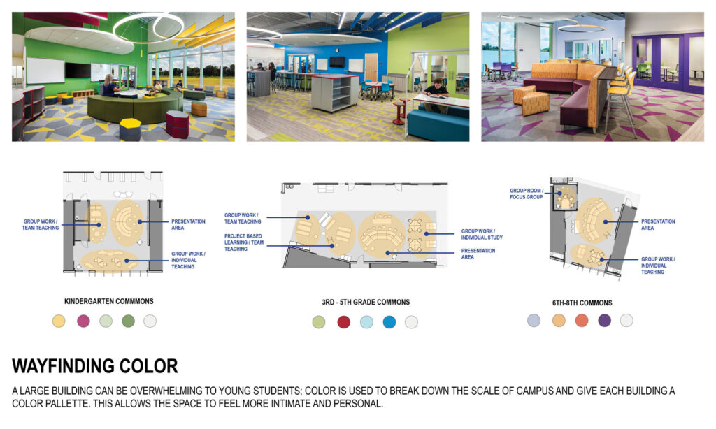 The outdoors is then brought indoors through lots of natural daylighting and glass garage doors. The windows all include solar shades which help limit direct sunlight while also adding playfulness to the façade through an ombre of color. The glass garage doors are used in specialty classrooms such as the DaVinci lab, Robotics lab and Science lab. These allow teachers to expand their classroom into the courtyard for indoor/outdoor learning.