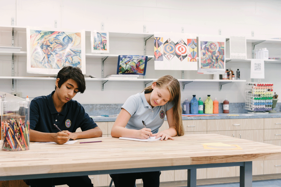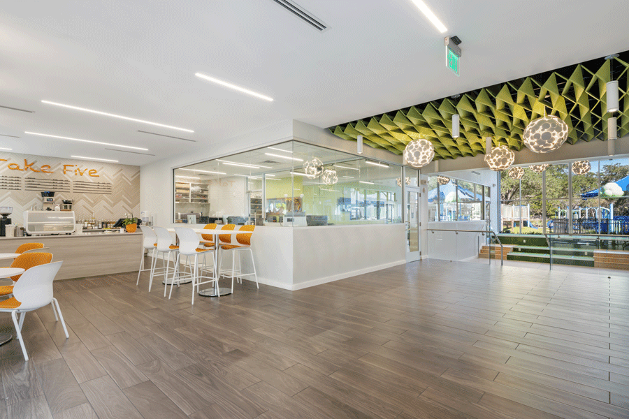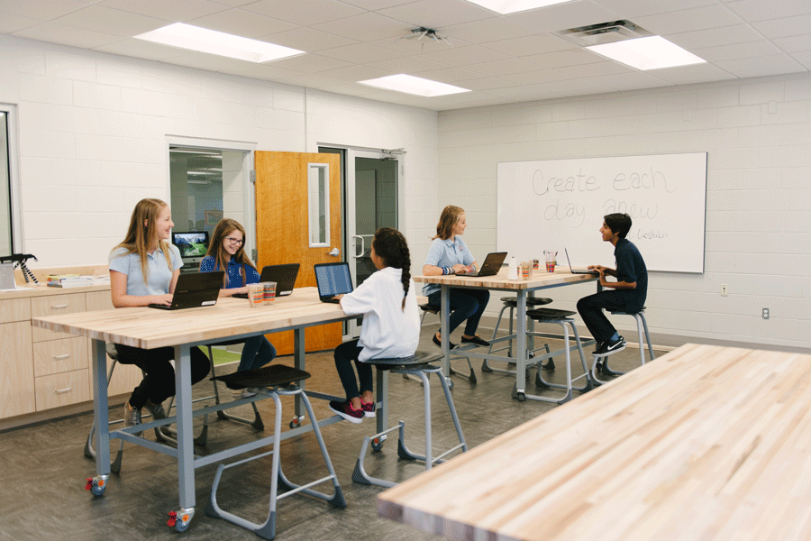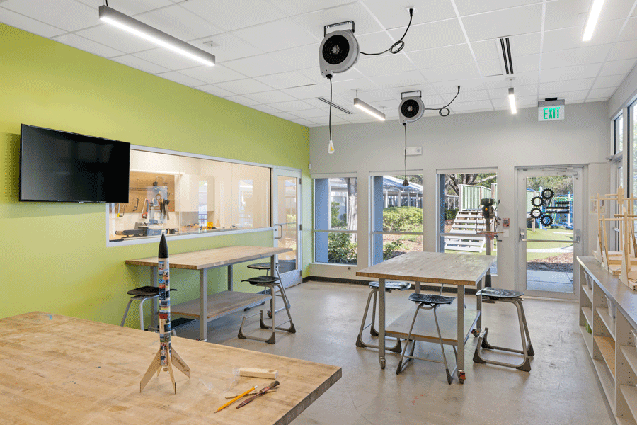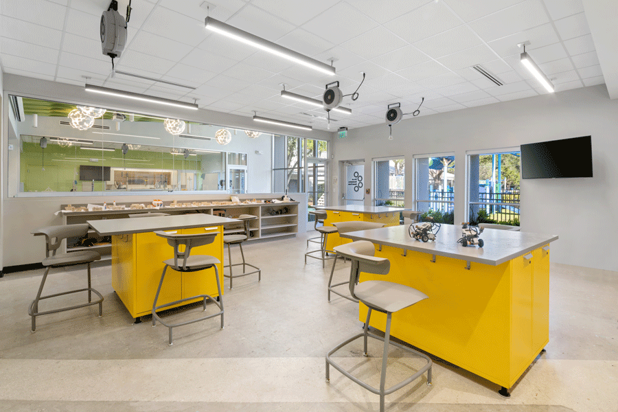 The Technology and Engineering building involved an extensive interior renovation of the underutilized 4,000 sf media center. By decentralizing the media center throughout the campus, the building was able to be converted into the technology and engineering building including a robotics course pit, vex lab, wood shop, 3D printing maker space, STEM lab, and coffee café. This technology hub is now the heart of the campus, centralized for all grades to access and learn.