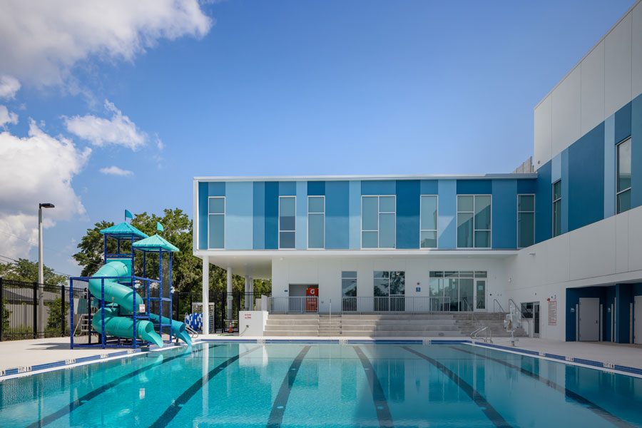 The Shore Acres neighborhood is notoriously prone to flooding, and for that reason, level 1 was raised to 11 ft. above grade, while much of the program (including the gymnasium) was built on level 2 for added resilience to rising sea levels and weather events. The lifeguard office, pool restrooms, and pump rooms (all at grade) are all fully floodproofed to protect against water damage.