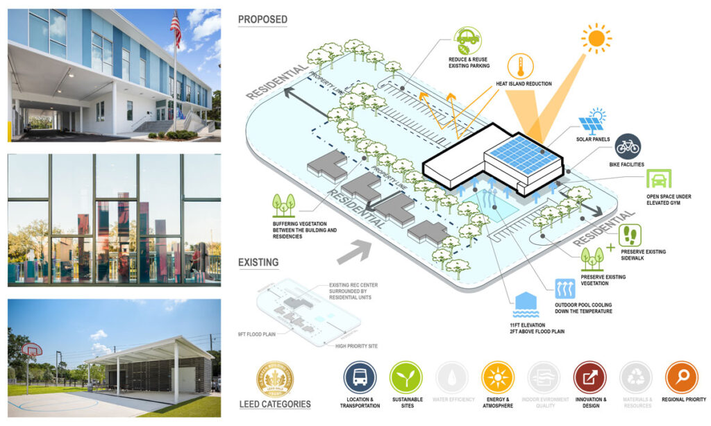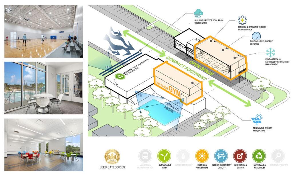 The Shore Acres Recreation Center demonstrates environmental responsibility, guaranteed energy efficiency, and promotes healthy interiors and resiliency.