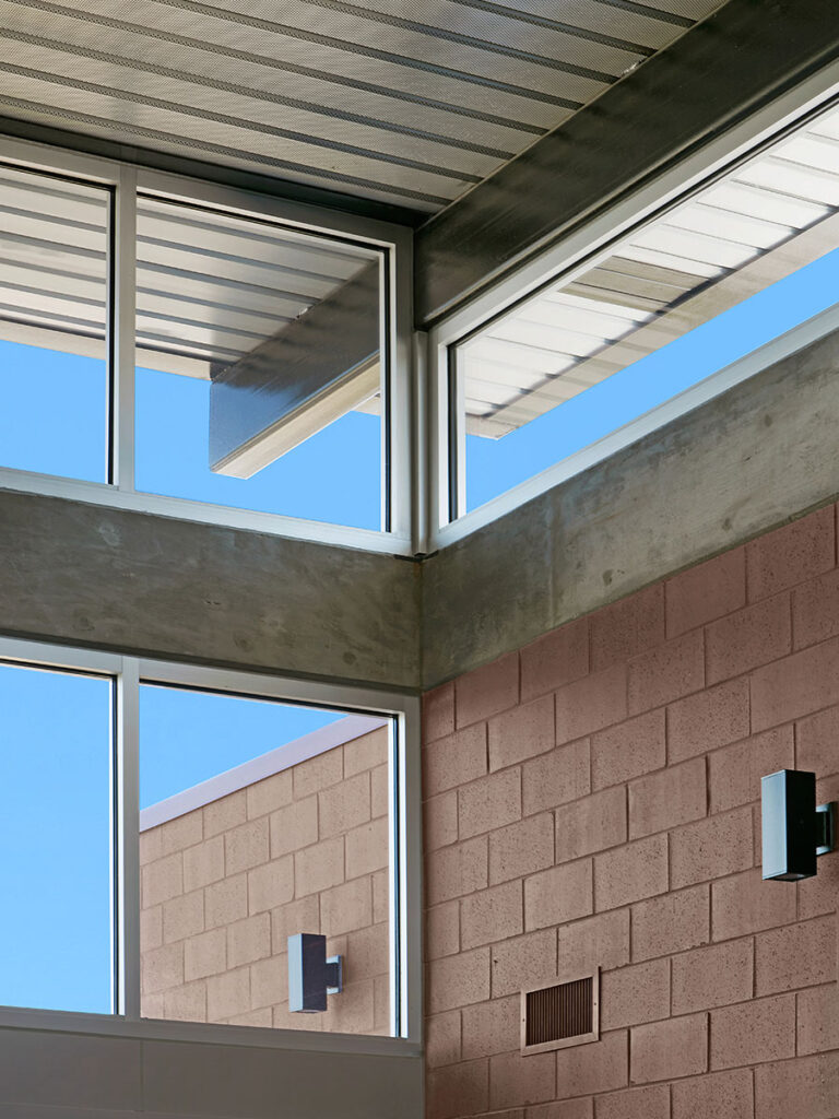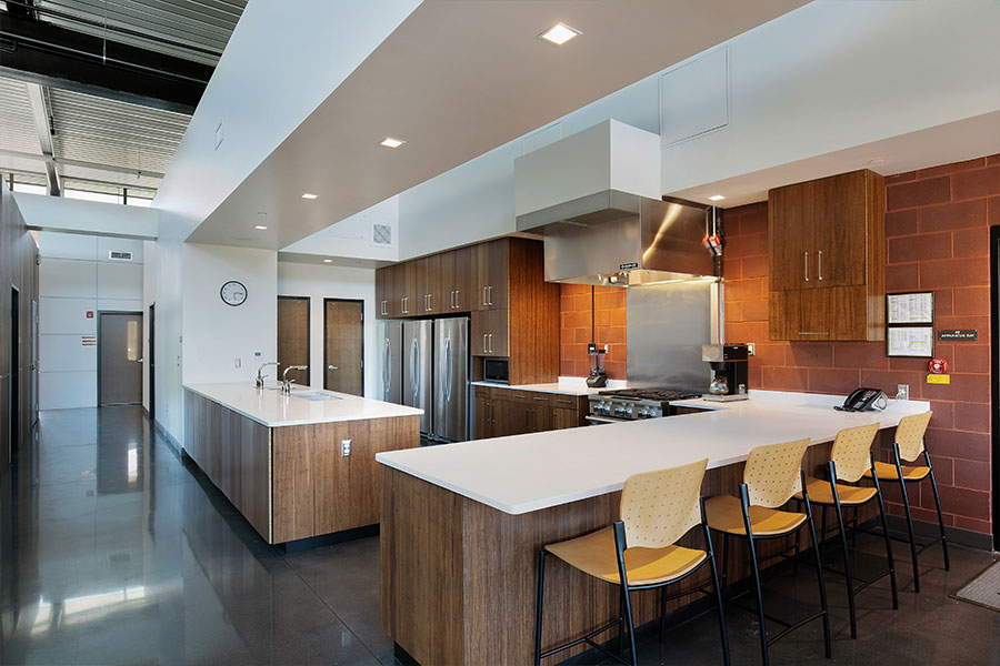 The use of sustainable and durable construction materials, including stained polished concrete floors, structural brick walls, quartz countertops, and bamboo plywood products virtually eliminates typical routine building maintenance — including re-painting — allowing the crew to focus on its job, training and service to the community. Large missile, level-E impact rated glass apparatus bay sectional doors, clerestory glass windows, and storefront window glazing systems used throughout the building provide great visibility and natural day lighting to all essential areas. The station also incorporates photovoltaic solar panels which generate 28.8 KW of power to offset power consumption throughout the year.