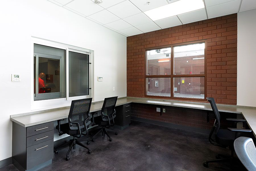 Clearstory windows throughout the building provide natural light into the apparatus bay, dayroom, and offices. Seven individual dorm rooms consist of large floor-to-ceiling lockers, lockable under-bed storage, operable windows, and programmable tones for fire and EMS. The firefighters are also provided with a designated training/workout room, individual toilet rooms permitting flexibility in gender usage, gear grid lockers, and lighting programmed and coordinated with radio alarm.
