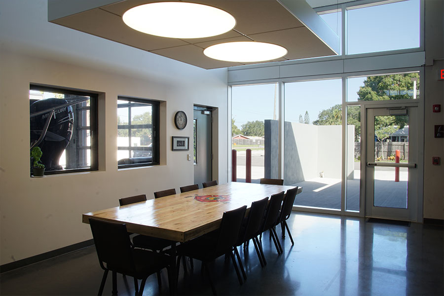 Program requirements include 3 apparatus bays, an officers’ office, additional office, reception, laundry room, mechanical room, data room, medical records room, and breakroom. The living quarters consist of eight dormitories, three bathrooms, a dayroom and a kitchen with pantry and dining.