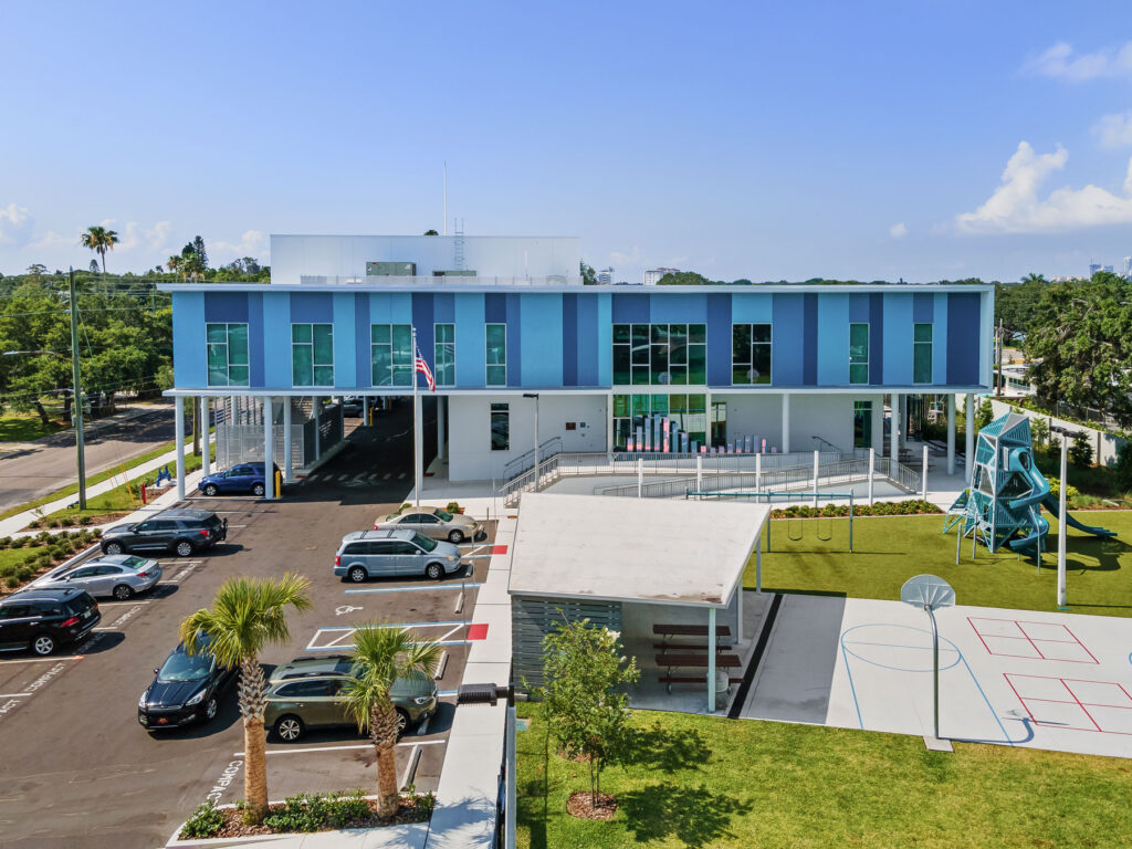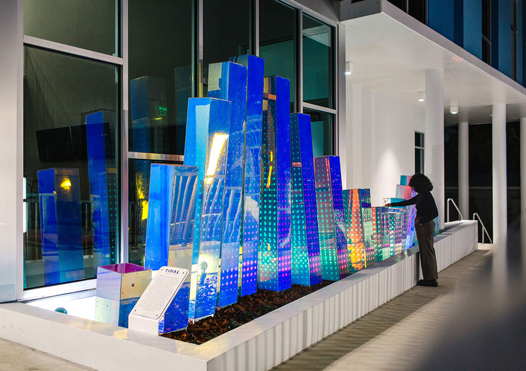 TIDAL is an interactive public art display created by the international award winning, multidisciplinary design studio The Urban Conga located at the entrance of Shore Acres Recreation Center, designed by WJA. This installation uses data points from NOAA to draw attention to the projected rise in sea levels for the surrounding community by the year 2100. This piece aims to educate and inspire conversations around climate change through open ended play.